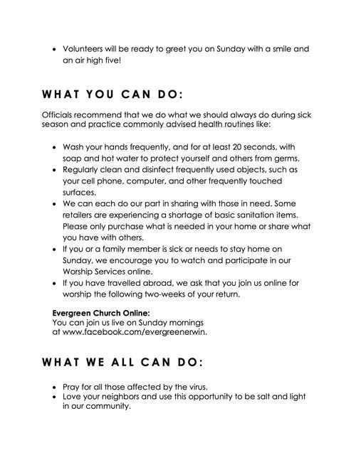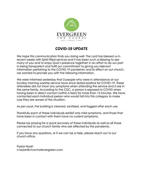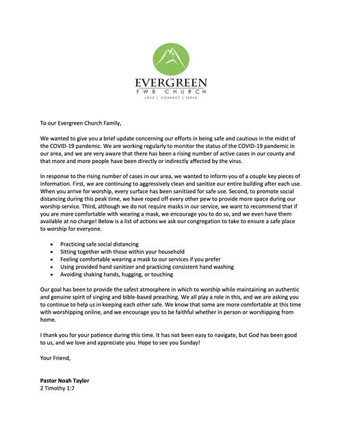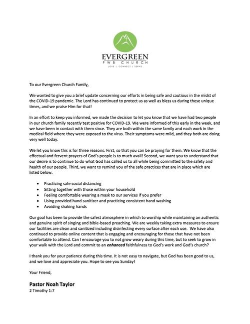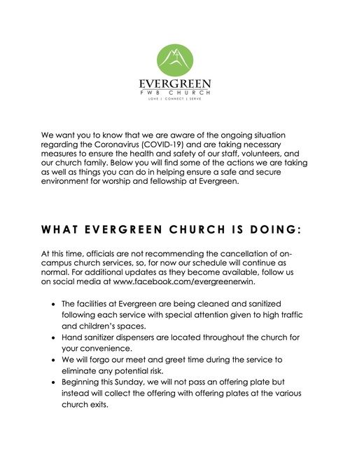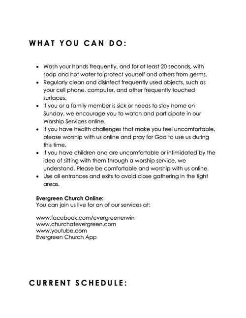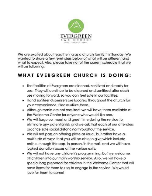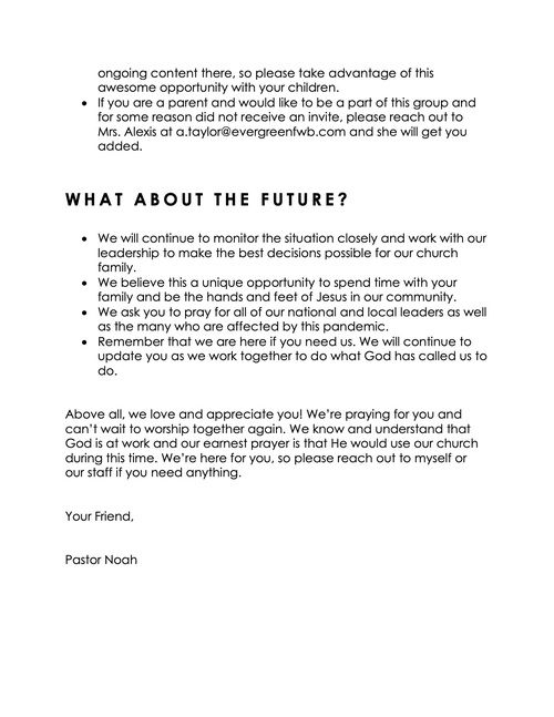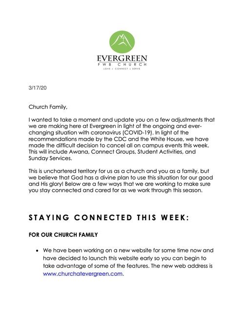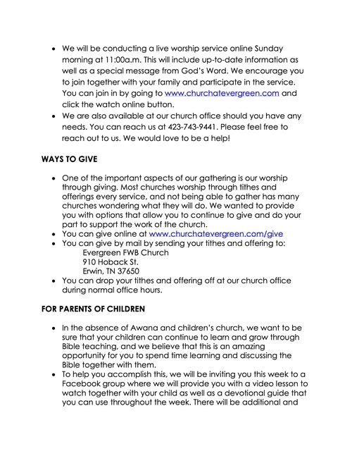 We also want to encourage you to continue to connect to our church online each week as well as continue to support the ministry of our Church through your continued giving. If you need help in any way feel free to contact our Church office anytime during the week.